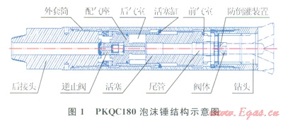空氣錘在油氣田“防斜打快”應用中逐步成熟[1-3],應用范圍從傳統(tǒng)防斜提速開始向定向鉆井發(fā)展[4]。但也還存在鉆遇地層出水,空氣錘易出現(xiàn)輸出功率低或不工作的問題[5]及地層液體倒灌氣缸污染空氣錘問題。國內(nèi)外曾在泡沫介質(zhì)中應用空氣錘鉆進[6-7],但主要限于淺地層,井底壓力較小,對空氣錘輸出功率影響程度較小。在油氣鉆井行業(yè),由于井深大,使用霧化或泡沫后井底壓力相對純氣體高,對常規(guī)空氣錘輸出功率影響較大,有必要同時發(fā)展適應于氣體(干氣)和霧化或泡沫(濕氣)鉆井介質(zhì)的泡沫錘技術(shù)。為此,筆者主要介紹了泡沫錘的研制背景、結(jié)構(gòu)及性能特點以及在現(xiàn)場中的應用效果。時導致空氣錘無輸出功率;針對此問題提出了綜合優(yōu)化后氣室初始體積、優(yōu)化尾管結(jié)構(gòu)尺寸、優(yōu)化動力單元間隙的技術(shù)建議。