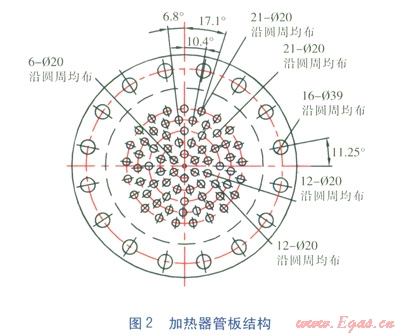 加熱器結(jié)構(gòu)見圖1。為確保換熱管加熱效率,換熱管在管板上二呈圓周布置,相鄰?fù)膱A上,管間距不同,從而導(dǎo)致管板結(jié)構(gòu)特殊,不同于GB 151—1999《管殼式換熱器》中規(guī)定的換熱管標(biāo)準(zhǔn)布管排列形式(正三角形排列或正四方形排列)。