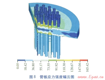 管板承受最高工作壓力為5.5MPa、最低工作壓力為0.0MPa,根據(jù)式(2)~(5),計(jì)算出在最高工作壓力pin=5.5MPa時(shí)管板承受各項(xiàng)載荷數(shù)據(jù),見表4。通過軟件計(jì)算,得到應(yīng)力強(qiáng)度幅云圖,見圖8,圖中數(shù)值為應(yīng)力強(qiáng)度幅,單位為MPa。