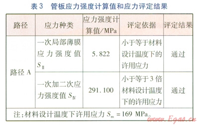 對(duì)于薄壁結(jié)構(gòu),JB 4732—1995《鋼制壓力容器——分析設(shè)計(jì)標(biāo)準(zhǔn)》(2005年確認(rèn))第5.3節(jié)給出了應(yīng)力強(qiáng)度的評(píng)定依據(jù):一次局部薄膜應(yīng)力強(qiáng)度值SⅡ小于等于1.5Sm;一次加二次應(yīng)力強(qiáng)度值SⅣ小于等于3Sm。對(duì)U形換熱管不存在管子對(duì)管板的彈性基礎(chǔ)作用,從管板系統(tǒng)安全裕度出發(fā),本工程SⅡ取小于等于1.0Sm。按照上述評(píng)判依據(jù),對(duì)計(jì)算應(yīng)力值與材料許用應(yīng)力值進(jìn)行比較,從而完成應(yīng)力評(píng)定,確定結(jié)構(gòu)承壓條件下的安全性[3]。應(yīng)力評(píng)定結(jié)果見表3。