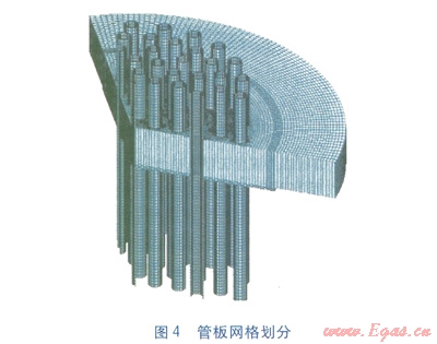 本例使用ANSYS軟件按表1尺寸建立有限元模型??紤]到管孔的對(duì)稱性,可建立l/3等效模型,見圖3。初步取管板厚度dn=68mm,其余結(jié)構(gòu)尺寸按表1選取。因換熱管采用焊接方式連接在管板上,建模時(shí)可以認(rèn)為換熱管與管板已達(dá)到一體化程度,單元是相互連接的,不存在接觸問題。應(yīng)力邊緣效應(yīng)的影響長(zhǎng)度公式為[2]:
