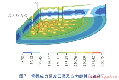 應(yīng)力線性化是ANSYS軟件對(duì)運(yùn)算結(jié)果進(jìn)行后處理以讀取計(jì)算數(shù)據(jù)的方法。應(yīng)力線性化路徑的選取原則是:通過應(yīng)力強(qiáng)度最大位置處的節(jié)點(diǎn),并以最短距離橫穿構(gòu)件壁的方向設(shè)定應(yīng)力線性化路徑[4]。軟件系統(tǒng)則在路徑上通過內(nèi)插法自動(dòng)生成插值點(diǎn),并把計(jì)算結(jié)果映射到路徑上。軟件會(huì)自動(dòng)對(duì)計(jì)算結(jié)果進(jìn)行應(yīng)力分類,并顯示相應(yīng)路徑下的各類計(jì)算應(yīng)力值?;诒?span lang="EN-US">2強(qiáng)度計(jì)算所需載荷數(shù)據(jù),通過軟件計(jì)算,得到管板應(yīng)力強(qiáng)度分布及應(yīng)力線性化路徑,見圖6、7,圖中數(shù)值為應(yīng)力強(qiáng)度,單位為MPa。