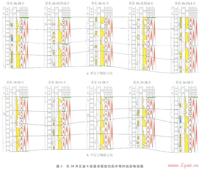 蘇里格地區(qū)盒8段砂體構(gòu)型可分為復(fù)合河道砂體和單一河道砂體,前者被稱為疊置河道砂,后者被稱為單河道砂。本文以層序地層學(xué)理論為依據(jù),在層序地層界面識(shí)別的基礎(chǔ)上,建立了召30井區(qū)盒8段高分辨率層序地層格架,通過中期基準(zhǔn)面的對(duì)比識(shí)別出疊置河道砂,進(jìn)而通過短期基準(zhǔn)面的對(duì)比識(shí)別出單河道砂,并定量刻畫該地區(qū)盒8段河道帶及河道砂體規(guī)模,建立儲(chǔ)集砂體構(gòu)型,以期為氣田開發(fā)過程中的井距優(yōu)化和天然氣“甜點(diǎn)”的選擇提供依據(jù),提高氣田開發(fā)效益。