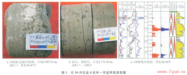 單一河道是指較長(zhǎng)周期的大洪水期形成的具有一定分布范圍的河道單元,其識(shí)別的意義在于復(fù)合河道內(nèi)垂向上的單一河道單元的劃分,每一期次洪水的流量、流速不盡相同。因此可以依據(jù)河道內(nèi)的泥質(zhì)層、細(xì)粒沉積的發(fā)育位置、沖刷面以及測(cè)井曲線的突變來對(duì)其進(jìn)行識(shí)別[20]。區(qū)內(nèi)單一河道的界面表現(xiàn)為(圖5):①?zèng)_刷面,代表洪水對(duì)前期沉積物的改造,多含泥礫;②泥巖及粉砂巖沉積,代表憩水期水體能量相對(duì)較弱時(shí)的細(xì)粒沉積,保存程度視后一期洪水能量的強(qiáng)弱而定;③測(cè)井曲線(GR)突變面。通過以上3種界面對(duì)召30井區(qū)盒8段短期基準(zhǔn)面旋回內(nèi)單一河道進(jìn)行識(shí)別,每個(gè)短期旋回內(nèi)均發(fā)育2~3期單一河道沉積。