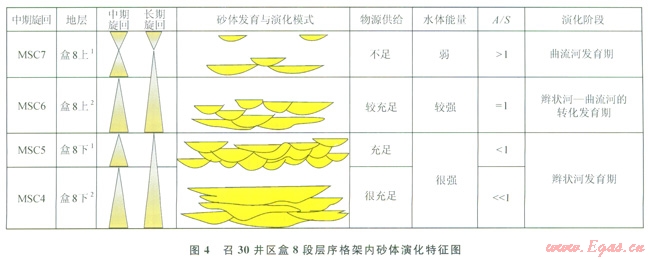 LSC2即盒8段上部層序由2個(gè)中期旋回(MSC3~MSC4)組成,底部旋回(MSC3)為向上變“深”的非對(duì)稱型,該中期旋回由2~3個(gè)(SSC7~SSC9)短期旋回組成,短期旋回由A型(向上“變深”非對(duì)稱型)向C型(對(duì)稱型)過渡,表明基準(zhǔn)面有所抬升,可容納空間增大;頂部旋回(MSC4)為以上升半旋回為主的不完全對(duì)稱型,此時(shí)源區(qū)構(gòu)造相對(duì)穩(wěn)定,物源供給量相對(duì)減少,基準(zhǔn)面抬升,可容納空間增大,A/S值大于1,該中期旋回由2~3個(gè)短期旋回組成(SSCl0~SSCl2)。