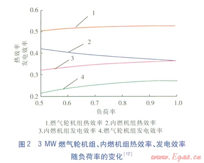 目前,相同發(fā)電功率的燃?xì)廨啓C(jī)組、內(nèi)燃機(jī)組的使用壽命、大修間隔時(shí)間基本相同,內(nèi)燃機(jī)組的單位發(fā)電功率運(yùn)行維護(hù)費(fèi)用略高于燃?xì)廨啓C(jī)組,但單位發(fā)電功率造價(jià)約為燃?xì)廨啓C(jī)組的50%。此外,對(duì)于具體的分布系統(tǒng),經(jīng)濟(jì)性還與全年負(fù)荷波動(dòng)、當(dāng)?shù)啬茉磧r(jià)格以及環(huán)保要求等指標(biāo)有關(guān)。