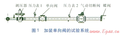 當用戶用氣設備突然停機,會造成調壓器出口管段內壓力瞬間升高,其原因主要是用氣設備的切斷速度極快(切斷時間小于1s),而調壓器的閥口關閉速度慢(需3~4s),調壓器閥口關閉的響應時間比用戶用氣設備切斷閥的切斷時間長,造成用戶用氣設備切斷后,調壓器上游還有少量氣體輸送至下游,造成下游管段壓力瞬間升高。如何抑制調壓器出口壓力的突然上升?本文從在調壓器出口管段上加裝單向閥、加裝安全放散閥以及調整用戶端用氣設備控制閥門的關閉程序等3個方面進行試驗研究。