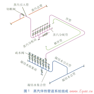 蒸汽伴熱系統(tǒng)組成見(jiàn)圖1,主要包括:蒸汽總管,蒸汽引入管,蒸汽分配站,伴管,被伴管,凝結(jié)水收集站,凝結(jié)水引出管,凝結(jié)水總管等[3]。