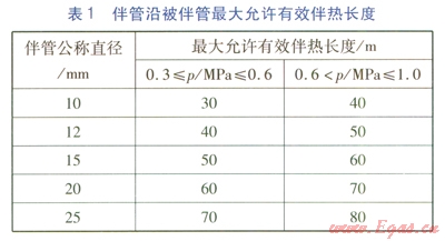 伴管沿被伴管的最大允許有效伴熱長(zhǎng)度按表1確定,表1p為蒸汽壓力。