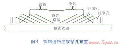 ③鉆孔:密切觀察鉆進(jìn)尺度及溢水出水情況,出現(xiàn)涌水時(shí),立即停鉆,先行注漿止水,再分析原因。確認(rèn)止水效果后,方可繼續(xù)鉆孔。鐵路線路注漿鉆孔布置見(jiàn)圖4。