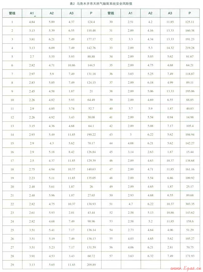 根據(jù)風(fēng)險(xiǎn)評(píng)估方法,計(jì)算出烏魯木齊市57條滅然氣管道的風(fēng)險(xiǎn)值(表2)。由表2可知,管網(wǎng)脆弱性指標(biāo)以1號(hào)管線最大,為4.84,其次是51號(hào)管線,為4.70,主要是因?yàn)楣芫€管輸氣體壓力大,管線使用年限較長,19號(hào)管線管輸氣體壓力小,最小埋深大管網(wǎng)脆弱性指標(biāo)最小,為2.23。事故誘因指標(biāo)以57號(hào)管線最大,為6.32,其次是51號(hào)管線,為6.22,主要是因?yàn)榻ㄖ┕ぁ⒌孛婊顒?dòng)情況和供水、排水沒施建設(shè)活動(dòng)較頻繁,15號(hào)管線位于郊區(qū),外界干擾少,事故誘因指標(biāo)最小,為2.63。事故后果指標(biāo)以3,號(hào)管線最大,為14.32,其次是38號(hào)管線,為13.33,主要是因?yàn)槿細(xì)夤芫W(wǎng)位于居住區(qū)、商業(yè)區(qū)內(nèi),人口密度和財(cái)產(chǎn)密度較高,泄漏危害嚴(yán)重;41號(hào)管線位于人煙稀少地區(qū),事故后果指標(biāo)最小,為0.94。全部管網(wǎng)風(fēng)險(xiǎn)平均值為112,1條天然氣管道風(fēng)險(xiǎn)評(píng)估值大于300,說明有較高的風(fēng)險(xiǎn);2條天然氣管道風(fēng)險(xiǎn)評(píng)估值在200~300之間,說明風(fēng)險(xiǎn)一般;54條天然氣管道風(fēng)險(xiǎn)值小于200,說明相對(duì)安全。綜合以上,由于管道周圍運(yùn)行環(huán)境不同,其風(fēng)險(xiǎn)也是不一樣的,51號(hào)管段的脆弱性指標(biāo)、事故誘因指標(biāo)和事故后果指標(biāo)較大,知此管段的風(fēng)險(xiǎn)等級(jí)較高。