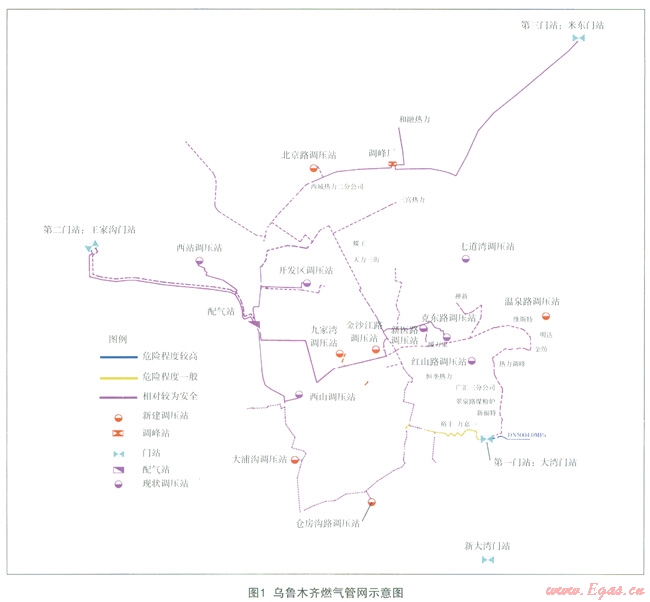 烏魯木齊城市燃?xì)夤芫W(wǎng)經(jīng)過十幾年的規(guī)劃、改造、建設(shè),形成了現(xiàn)在的燃?xì)饩W(wǎng)絡(luò)(圖1),烏魯術(shù)齊市天然氣覆蓋區(qū)域逐漸從以天、沙、新、水、米東5個(gè)主城區(qū)為主,延伸至頭屯河區(qū)、達(dá)坂城等城郊區(qū)域,已全面實(shí)現(xiàn)氣化目標(biāo),成為首個(gè)率先實(shí)現(xiàn)全面“氣化”的省會(huì)城市。