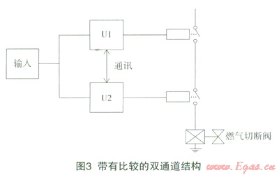 圖1中,U控制通道可以是MCU及其輸入輸出電路組成,具有完整的控制功能。這里所說(shuō)的初級(jí)安全保護(hù)是指MCU周期性的自檢,包括RAM、ROM、指令譯碼與執(zhí)行尋址與數(shù)據(jù)路徑、程序計(jì)數(shù)器(Program Counter)、輸入輸出等內(nèi)部故障的測(cè)試;第二級(jí)安全保護(hù)是失效監(jiān)控電路,是獨(dú)立于以上通道的,可以根據(jù)輸入的狀態(tài)來(lái)判定控制通道U的輸出是否正常,當(dāng)控制通道U的控制功能失效后,監(jiān)控電路可以保證燃?xì)忾y的切斷功能受控,監(jiān)控電路的輸出控制應(yīng)是獨(dú)立的執(zhí)行機(jī)構(gòu)(如繼電器)。監(jiān)控電路可以是MCU構(gòu)成控制電路,也可以是一般電子器件構(gòu)成的回路。