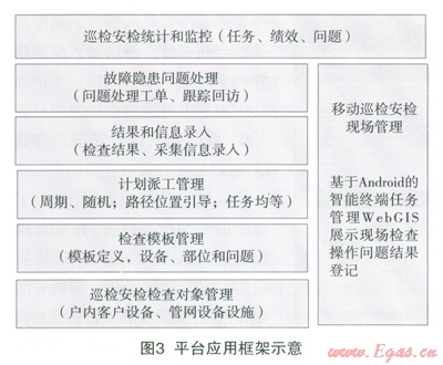 為支持外勤應(yīng)用,系統(tǒng)還包括了移動安檢巡檢應(yīng)用。移動應(yīng)用支持多種移動智能手機(jī)或平板電腦等終端設(shè)備,實現(xiàn)了巡檢安檢任務(wù)管理、基于WebGIS的任務(wù)展示,以及在線或離線方式的巡檢安檢項目記錄、信息收集錄入等功能。另外,系統(tǒng)還提供了豐富的巡檢安檢統(tǒng)計和監(jiān)控管理模塊,可以隨時查看外勤人員的任務(wù)執(zhí)行情況,問題或隱患分布情況,整改情況等。