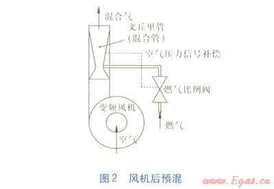 目前市場上的全預混冷凝式燃氣壁掛爐(以下簡稱全預混壁掛爐)主要有風機前預混、風機后預混兩種,分別見圖l、2。變頻風機、燃氣比例閥[2-3]提供燃燒所需的空氣與燃氣,空氣與燃氣按設定好的空燃比進行混合燃燒。