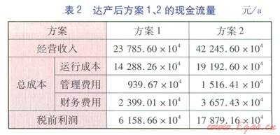 本文采用內(nèi)部收益率(稅前)、凈現(xiàn)值(稅前)、動態(tài)投資回收期(稅前)作為方案經(jīng)濟性評價指標。內(nèi)部收益率的經(jīng)濟含義是項目在其壽命期內(nèi)未回收資金的預計收益率,項目投入運營后,投資額將通過每年所產(chǎn)生凈效益的形式逐步得到回收。已回收部分將用于再投資,未回收部分待繼續(xù)回收,內(nèi)部收益率就是指未回收部分的收益率,因此稱為內(nèi)部收益率。凈現(xiàn)值的經(jīng)濟含義是項目在其壽命期內(nèi)預計創(chuàng)造的全部凈效益。內(nèi)部收益率、凈現(xiàn)值都是反映項目贏利能力的指標,前者體現(xiàn)的是相對贏利能力,后者體現(xiàn)的是絕對贏利能力。內(nèi)部收益率、凈現(xiàn)值越大,項目贏利能力越強。動態(tài)回收期越短,說明項目收回投資額的時間越短。方案1、2的經(jīng)濟性評價指標見表3。由表3可知,方案2的內(nèi)部收益率、凈現(xiàn)值均高于方案l,且方案2的動態(tài)投資回收期短于方案l,這說明方案2的經(jīng)濟性優(yōu)于方案l。