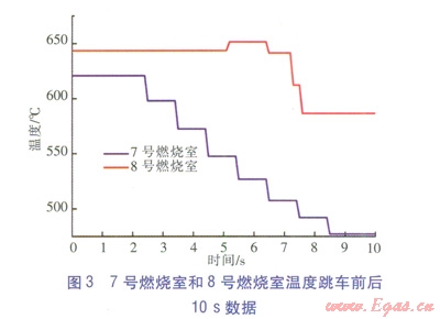 SGT-200-2S燃?xì)廨啓C(jī)有8個(gè)燃燒室,每個(gè)燃燒室都設(shè)置了測溫?zé)犭娕迹?span lang="EN-US">7號燃燒室和8號燃燒室跳車前后10s數(shù)據(jù)如圖3所示,其他燃燒室溫度變化情況與8號燃燒室情況類似。