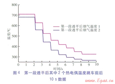 燃?xì)廨啓C(jī)第一段透平后設(shè)置了16個(gè)測溫?zé)犭娕?,其?span lang="EN-US">2個(gè)熱電偶跳車前后l0s數(shù)據(jù)如圖4所示,根據(jù)熱電偶測點(diǎn)位置可以確定這兩個(gè)熱電偶測得的是7號燃燒室后的煙氣溫度。圖4中的數(shù)據(jù)顯示第一級透平后的溫度甚至高于圖3中燃燒室的溫度,這是因?yàn)閳D3中顯示的燃燒室溫度并不是透平進(jìn)口初溫(該溫度通常為ll00℃以上),而是實(shí)際燃燒室內(nèi)熱電偶布點(diǎn)處的溫度,由于燃燒室溫度并不是均勻的,該熱電偶所處位置溫度較低。