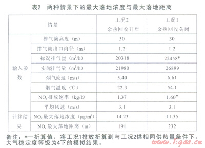 (4)通過(guò)實(shí)際煙氣余熱回收與否兩種工況的濃度對(duì)比分析,得出:余熱回收工況NOx最大落地濃度略有增加,但是迅速衰減。無(wú)論是哪一種工況,其排放均遠(yuǎn)低于《環(huán)境空氣質(zhì)量標(biāo)準(zhǔn)》(GB3095—2012)中的二類(lèi)區(qū)NO2lh平均值(200mg/m3);且余熱回收工況最大落地距離減小了l7.6%,減小了污染范圍。