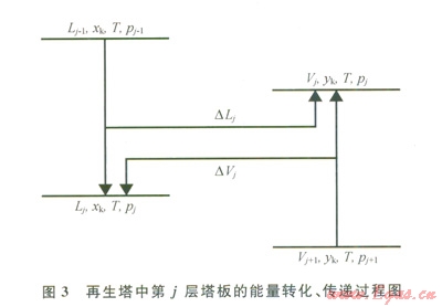 圖3表示再生塔中第j層塔板上能量的傳遞與轉(zhuǎn)換過程?,F(xiàn)以其作為研究對象,對該層塔板進(jìn)行分析。