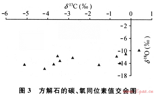 無論是不穩(wěn)定組分的溶解和交代作用還是碳酸鹽膠結(jié)作用,都與酸性水有關(guān),同時(shí)還需要孔隙水的不斷滲流和交替,否則溶解和膠結(jié)作用將很快達(dá)到相對(duì)平衡狀態(tài)而停止。儲(chǔ)層砂巖中鈣質(zhì)膠結(jié)物δ18O值為-9.8‰~-15.97‰,平均為-13.09‰;δ13C值為-5.11‰~0.41‰,平均為-2.29‰。碳酸鹽膠結(jié)物的碳、氧同位素總體上表現(xiàn)為正相關(guān)性(圖3),折算溫度為105~135℃[4]。根據(jù)碳同位素特征表明,該區(qū)碳同位素值偏負(fù),與有機(jī)質(zhì)排烴時(shí)生成的有機(jī)酸有關(guān)[5~6],其反應(yīng)方程為: