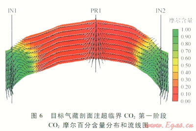 圖6給出了目標(biāo)氣藏剖面模型超臨界CO2埋存及驅(qū)替天然氣初期,CO2摩爾百分含量及地層流體滲流的流線分布。圖中流線方向顯示,反韻律地層中,超臨界CO2從2口注氣井下部注入后,受滲透率反韻律影響,先是沿近井區(qū)地層向上部流動(dòng),然后在密度流和重力分異作用下,沿水平和下傾方向向氣藏中部和下部運(yùn)移,而天然氣被驅(qū)向氣藏中部和上部。超臨界CO2前緣推進(jìn)較為均勻,氣體對(duì)流擴(kuò)散運(yùn)移對(duì)超臨界CO2 天然氣過渡帶的擾動(dòng)較小,而儲(chǔ)層非均質(zhì)影響較大,上部高滲層中超臨界CO2彌散和滲流快,重力舌進(jìn)現(xiàn)象較強(qiáng),過渡帶寬度大于下部低滲層。