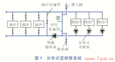 隨著我國(guó)供熱行業(yè)節(jié)能意識(shí)的不斷增強(qiáng),分布式變頻泵系統(tǒng)在供熱領(lǐng)域的應(yīng)用越來(lái)越廣泛。分布式變頻泵系統(tǒng)的熱源循環(huán)泵只需要克服熱源內(nèi)部阻力,大大減小了熱源循環(huán)泵的能耗。分布式變頻泵承擔(dān)熱用戶(hù)(熱力站)的流量,克服熱用戶(hù)及管網(wǎng)阻力。與傳統(tǒng)動(dòng)力集中式系統(tǒng)相比,降低了近端熱用戶(hù)節(jié)流富裕壓頭造成的能量損失。因此,理論上分布式變頻泵系統(tǒng)沒(méi)有多余的能耗,比傳統(tǒng)動(dòng)力集中式系統(tǒng)節(jié)能。分布式變頻泵系統(tǒng)見(jiàn)圖4。