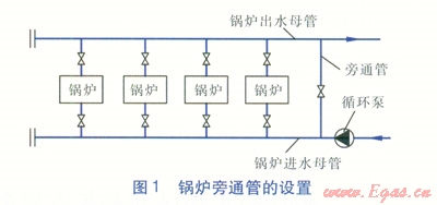 在熱水鍋爐房系統(tǒng)中,在鍋爐的進(jìn)出水母管之間一般設(shè)置一條旁通管道(見(jiàn)圖l)。鍋爐旁通管有以下兩種作用,分別計(jì)算確定鍋爐旁通管管徑后,選取較大的管徑。