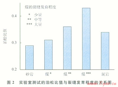 Gregory發(fā)現(xiàn)巖石的裂縫引起縱橫波速度比和泊松比的增大[7]。Ramos and Davis實驗測試表明新墨西哥州Cedar Hill Field的煤層樣品泊松比和裂縫密度有關[8-9](圖2),可以看出煤層的泊松比隨著裂縫密度由低到高增加了30%。當然實驗室測量結果不等同于現(xiàn)場煤層的割理情況,但是圖2所揭示的泊松比和煤層裂縫密度之間的關系是可靠的,可用于現(xiàn)場煤層泊松比和裂縫密度的預測,即煤層的泊松比和裂縫密度為正相關。在AVO理論中,假定vp/vs=2,偽泊松比反射率(Ds/s)等于截距與梯度之和的一半[9],反映的是反射界面兩側介質的泊松比差值,與泊松比是呈正相關的。因此,AVO反演得到的偽泊松比反射系數(shù)屬性可以用于指示裂縫發(fā)育特征,偽泊松比值大,則裂縫發(fā)育程度高。