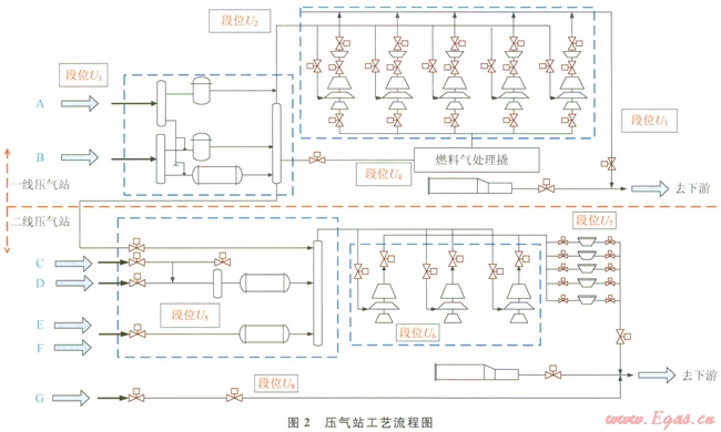 某壓氣站包括一線工程和二線工程。其中,一線有2路來氣,設(shè)計輸量為120×108m3/a(在0℃,l個標(biāo)準(zhǔn)大氣壓下的氣體體積)。二線有5路來氣,設(shè)計輸量為l20×108m3/a。各路來氣壓力約為4MPa,一線經(jīng)過壓縮機(jī)組加壓后壓力約為6.4MPa,二線經(jīng)加壓后壓力上升為9.6MPa。根據(jù)壓氣站的工藝關(guān)斷閥和ESD閥的設(shè)置情況,將該站場分為8個工藝段位,分別見壓氣站工藝流程圖2和表l所示。