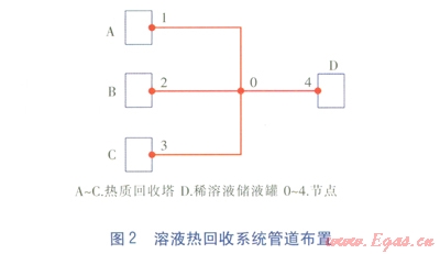 某溶液熱回收系統(tǒng)管道布置見圖2,溶液分別從熱質(zhì)回收塔A、B、C吸收熱量后在節(jié)點(diǎn)0匯合,進(jìn)入稀溶液儲(chǔ)液罐D。