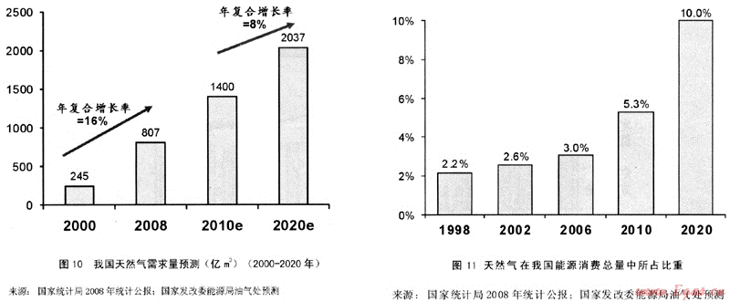 綜上所述,我國(guó)天然氣行業(yè)未來(lái)幾年仍將保持高速增長(zhǎng)。國(guó)家發(fā)改委能源局油氣處預(yù)測(cè)未來(lái)天然氣需求仍將保持快速增長(zhǎng),2010年天然氣需求將達(dá)到1400億m3,2020年將達(dá)到2037億m3,2010年至2020年復(fù)合增長(zhǎng)率達(dá)到8%(見(jiàn)圖10)。此外,天然氣在中國(guó)能源消費(fèi)總量構(gòu)成中的占比逐年提高,預(yù)計(jì)到2010年將達(dá)到5.3%,到2020年將達(dá)到10%(見(jiàn)圖11)。