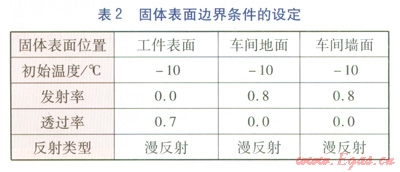 采用S2S(Surface-to-Surface)輻射換熱模型,忽略車間內(nèi)空氣對(duì)輻射板輻射能的吸收,模擬輻射板對(duì)車間內(nèi)工件、地面、墻面的熱輻射過程,以及車間內(nèi)主要的流固耦合過程。以基爾霍夫定律為基礎(chǔ),由STAR-CCM+軟件可直接計(jì)算各表面的反射率,從而進(jìn)行輻射換熱量計(jì)算。熱源(即輻射板)與各固體表面邊界條件的設(shè)定見表1、2。