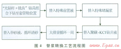 該轉(zhuǎn)換用鉆井液體系的組成為:①特殊前置液,配方:油基潤(rùn)濕反轉(zhuǎn)劑+柴油+氧化瀝青粉,利用油基潤(rùn)濕反轉(zhuǎn)劑特性,改變巖石表面性質(zhì),變親水表面為憎水表面,阻止水分進(jìn)入地層,防止井壁坍塌。②特殊堵漏漿,通過鉆井液中加入適量無(wú)滲透、聚合醇、陽(yáng)離子乳化瀝青等處理劑來(lái)實(shí)現(xiàn)鉆井液的防漏作用。③含油聚磺一KCl鉆井液,具有“二強(qiáng)二高一低”特征。④舉砂液,建立井筒循環(huán)之后清潔井眼所用,通過高密度、高黏度的特點(diǎn)充分?jǐn)y帶井筒巖屑。形成了一套適合塔里木山前礫石層地質(zhì)特征的鉆井液轉(zhuǎn)換工藝技術(shù)(圖4),保障安全實(shí)施。