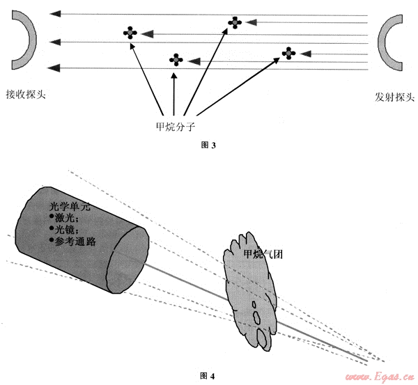 SELMA發(fā)射激光束(1.65μm-近紅外光):激光遇到物體后,漫反射光被光學(xué)單元內(nèi)的拋物柱面鏡所收集,當(dāng)激光遇到甲烷氣團(tuán)。激光的能量被甲烷氣團(tuán)吸收成為甲烷氣團(tuán)的能量組成部分;較少的激光被反射回光學(xué)單元,使接收到的激光信號(hào)減弱;這種減弱會(huì)被專用軟件所處理。利用激光對(duì)甲烷具有極好的選擇性,收集激光在甲烷氣團(tuán)中的散射光,通過(guò)軟件的算法,實(shí)現(xiàn)甲烷的濃度峰值的計(jì)算,同時(shí)避免了其它碳?xì)浠衔锏母蓴_。如汽車尾氣等。見圖4。