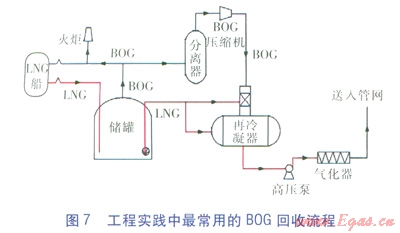 正常情況下,儲罐的日蒸發(fā)量(質(zhì)量比)大約在0.03%~0.08%左右,對于大型儲罐來說,這已相當(dāng)可觀,對其進行回收可以帶來巨大的經(jīng)濟和社會效益。目前,BOG回收包括二方面內(nèi)容,一是對LNG氣化產(chǎn)生的天然氣進行回收,二是對BOG攜帶的冷量進行回收。
