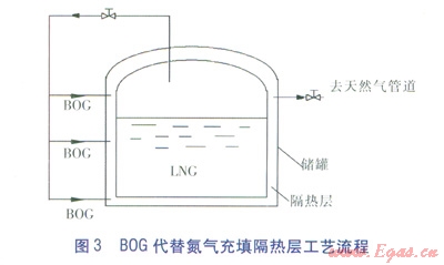 BOG氣體需要及時排出以維持儲罐的微正壓,一個辦法是使用BOG代替氮氣充填隔熱層。利用BOG充填絕熱層只需在原儲罐基礎(chǔ)上稍加改造就可實現(xiàn),投資很少,可以省去制氮設(shè)備,經(jīng)濟高效,且熱量流入時首先會被低溫的BOG氣體吸收,儲罐的隔熱效果更好。俞樹榮、席家福[10]在這方面進行了探索和論證,并對BOG充填隔熱層進行了傳熱分析,給出了具體的計算,提出了BOG代替氮氣充填隔熱層的工藝流程(見圖3)。但是,充填隔熱層用量對于大型儲罐的日產(chǎn)BOG量來說比較小,并不能從真正意義上減少BOG的排放。