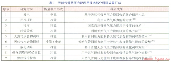 目前,管網(wǎng)壓力能利用技術(shù)研究成果隨著天然氣產(chǎn)業(yè)的蓬勃發(fā)展而取得了很大的進(jìn)展,研究領(lǐng)域涉及面較廣。國(guó)內(nèi)外在壓力能利用方面的成功案例仍局限于發(fā)電和制冰,且壓力能利用效率也較低,因此,國(guó)內(nèi)外的學(xué)者一直致力于壓力能的利用效率研究以提高壓力能利用效率。