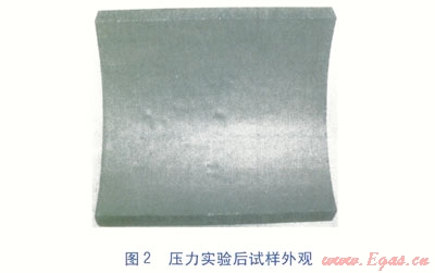 壓力實(shí)驗(yàn)后試樣外觀見圖2。比較圖1、2可知,壓力實(shí)驗(yàn)前后涂層顏色未出現(xiàn)明顯變化,涂層表面光滑平整,無起泡、針孔、裂紋等現(xiàn)象,也未腫脹及變軟。涂層與基材之間未脫落,附著情況良好。