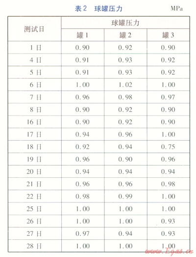 儲氣溫度與壓力是影響球罐內(nèi)鼙腐蝕的環(huán)境因素[2]。球罐儲氣溫度為-10~60℃。2013年2月各測試日3臺球罐的壓力(10:00的數(shù)據(jù))見表2。由表2可知,罐l~3壓力范圍分別為0.90~1.00、0.90~1.02、0.75~1.00MPa。通常,設(shè)計(jì)壓力為運(yùn)行壓力的l.2倍,因此在壓力實(shí)驗(yàn)時(shí)選取1.2 MPa作為實(shí)驗(yàn)壓力。各項(xiàng)實(shí)驗(yàn)中選取的基材材質(zhì)與球罐罐體內(nèi)壁材質(zhì)一致,涂層平均厚度為175mm。