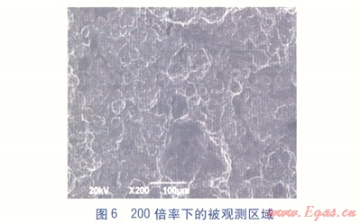 掃描電鏡為JSM—6490LV型掃描電子顯微鏡,采用20kV加速電壓,在真空條件下對壓力實(shí)驗(yàn)336h后且進(jìn)行交流阻抗實(shí)驗(yàn)后的涂層進(jìn)行掃描,在放大倍率為200、500的情況下觀察涂層的表面形貌(分別見圖6、7)。由圖6、7可知,被觀測區(qū)域有一個(gè)腐蝕形成的不規(guī)則凹坑(顏色較深部分),但腐蝕并不嚴(yán)重。