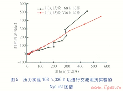 實(shí)驗(yàn)?zāi)康氖菧y試涂層對基材的保護(hù)能力。交流阻抗實(shí)驗(yàn)選用的儀器為電化學(xué)測試用PARSTAT2273電化學(xué)工作站,采用經(jīng)典一三電極體系:參比電極為飽和甘汞電極(SCE),輔助電極為鉑電極,帶涂層的基材為工作電極。分別對實(shí)驗(yàn)時(shí)間為1h、2h、168h、336h的壓力實(shí)驗(yàn)試件進(jìn)行交流阻抗實(shí)驗(yàn)[3],實(shí)驗(yàn)數(shù)據(jù)采用ZsimpWin軟件擬合,并擬合出Nyquist圖譜(見圖4、5)。圖4、5并未出現(xiàn)文獻(xiàn)[4]提供的曲線形態(tài)(該曲線形態(tài)表征腐蝕物穿透涂層,對基材造成損害)可得到以下結(jié)論:涂層有效阻擋了天然氣腐蝕性物質(zhì)向基材的擴(kuò)散。
