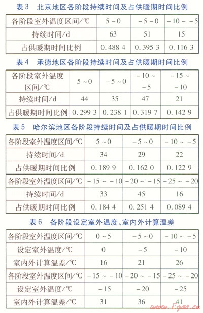 下面以北京、承德、哈爾濱地區(qū)為例,分析分布式循環(huán)泵供熱系統(tǒng)節(jié)能率的影響因素。北京、承德、哈爾濱地區(qū)各階段持續(xù)時(shí)間及占供暖期時(shí)間比例分別見(jiàn)表3~5。各階段設(shè)定室外溫度、室內(nèi)外計(jì)算溫差見(jiàn)表6。根據(jù)表3~6數(shù)據(jù),并依據(jù)相關(guān)規(guī)范設(shè)定3個(gè)地區(qū)建筑物圍護(hù)結(jié)構(gòu)熱工參數(shù)。經(jīng)計(jì)算呵得到,北京、承德、哈爾濱地區(qū)采用分布式循環(huán)泵供熱系統(tǒng)的節(jié)能率分別為20.0%、19.7%、18.5%。