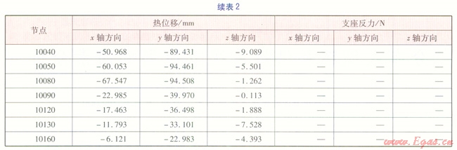 輸入數(shù)據(jù):熱水溫度130℃,設(shè)計(jì)壓力1.6MPa,管材Q2358,管道外直徑1220mm,直管壁厚16mm,彎頭壁厚18mm。其他參數(shù)可通過AutoPSA應(yīng)力分析軟件,實(shí)現(xiàn)手動(dòng)調(diào)用或自動(dòng)調(diào)用。建立好的計(jì)算模型經(jīng)AutoPSA應(yīng)力分析軟件分析計(jì)算,得到一次應(yīng)力、二次應(yīng)力、熱位移、支座反力。應(yīng)力驗(yàn)算結(jié)果見表1,熱位移、支座反力見表2。由表1可知,供熱管道各單元的一次應(yīng)力、二次應(yīng)力均滿足《規(guī)范》要求。表2數(shù)據(jù)可作為結(jié)構(gòu)專業(yè)設(shè)計(jì)桁架的基礎(chǔ)數(shù)據(jù),表中負(fù)號(hào)表示方向與坐標(biāo)軸正向相反。