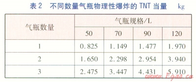 另外,部分CNG汽車會將幾個氣瓶放在一起,且放置距離較近。當(dāng)一個氣瓶發(fā)生爆炸時,可能會引發(fā)周圍的其他氣瓶爆炸,從而導(dǎo)致爆炸能量成倍增加。表2為不同數(shù)量的4種常用氣瓶在20MPa的情況下破裂后發(fā)生物理性爆炸的TNT當(dāng)量。