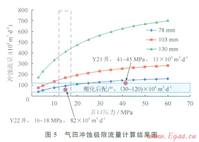 在氣田生產(chǎn)過(guò)程中,為了進(jìn)一步分析產(chǎn)量過(guò)高的原因產(chǎn)生的沖蝕,開(kāi)展了不同單井井口壓力和產(chǎn)量下的臨界沖蝕流量的計(jì)算。根據(jù)氣田的具體情況,井口設(shè)備的節(jié)流閥通徑分別為78mm、103mm、130mm。因此,分別計(jì)算了氣田工況范圍下的單井極限沖蝕流量。根據(jù)計(jì)算結(jié)果可以看到,將2口典型井在試氣時(shí)的工況標(biāo)在計(jì)算圖(圖4)中,2口井均在沖蝕流量之下(圖5)。在氣田生產(chǎn)中,根據(jù)開(kāi)發(fā)配產(chǎn),建議井口產(chǎn)氣量限制在70×104~95×104m3/d,少數(shù)井配產(chǎn)在100×104m3/d或以上時(shí),井口閥的尺寸要求換成100.5mm。由此確定井口采氣樹(shù)選擇如下:產(chǎn)量小于80×104m3/d,主通徑(標(biāo)稱尺寸)為78mm;產(chǎn)量在80×104~200×104m3/d,主通徑為103mm;產(chǎn)量大于200×104m3/d,主通徑為130mm。