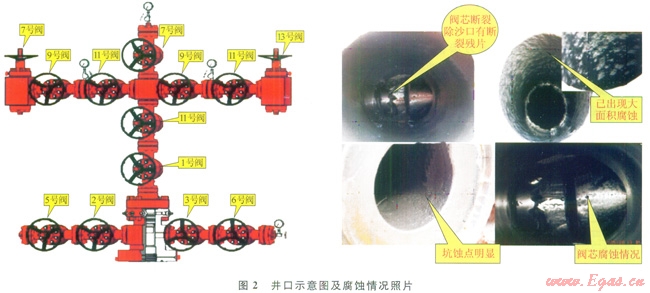 1)阿姆河酸性氣田高含硫化氫和二氧化碳,單井產(chǎn)能高。氣田屬于中一嚴(yán)重腐蝕環(huán)境,井口設(shè)備在生產(chǎn)過(guò)程中出現(xiàn)了不同程度腐蝕,出現(xiàn)腐蝕的井口位置基本相似,主要表現(xiàn)為坑蝕、點(diǎn)蝕,伴有閥芯斷裂的情況,在一定程度上影響了正常生產(chǎn)。腐蝕主要來(lái)源于酸性環(huán)境下的沖蝕腐蝕。