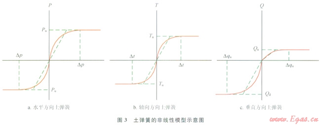 根據(jù)ASCE Guidelines.for the Design of Buried Steel Pipe[21,斷層作用下,土壤對管道的作用可以用彈塑性土彈簧來表示,包括管道軸向、側向和垂向的土彈簧(圖2)。筆者采用管土相互作用(PSI)單元模擬管土相互作用,PSl單元如圖2-b所示,由4個節(jié)點組成,單元上端2個節(jié)點(3和4)與地表面相連,反映地面運動與位移,下端2個節(jié)點(1和2)與管道單元相連,管土相互作用關系以非線性單元剛度表示,單元剛度與土彈簧剛度一致。通過將斷層位移施加在斷層右側PSI單元的土壤節(jié)點上可以來模擬斷層的作用。等效土彈簧的力學性能可以用極限抗力與屈服位移2個量來描述。Pu、Tu、Qu和Qd代表了3個方向的極限抗力,Dp、Dt、Dqd和Dqu代表了3個方向的屈服位移(圖3)。