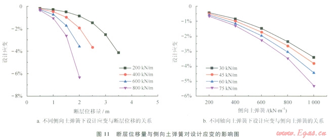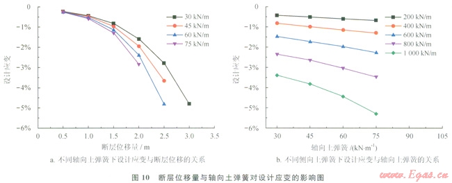 通過研究不同土彈簧的取值影響來考慮土壤特性對管道設計應變的影響,圖10給出了不同軸向和側向土彈簧下設計應變的變化規(guī)律。由圖10-a可以得到,軸向土彈簧越大,設計應變越大。在不同軸向土彈簧下管道設計應變隨斷層位移量的變化形式保持一致,依舊保持著類似冪函數(shù)的關系。這里分析不同側向土彈簧下應變隨軸向土彈簧的變化規(guī)律來分析軸向和側向土彈簧的相互影響,從圖10-b可以發(fā)現(xiàn),在不同側向土彈簧下設計應變隨軸向土彈簧保持單調的規(guī)律,軸向土彈簧越大設計應變越大,同時側向土彈簧越大設計應變也越大。