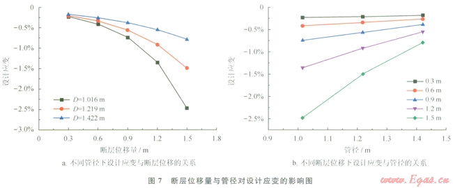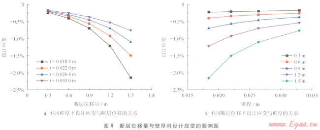 圖7、8給出了不同斷層錯動位移下管徑和壁厚對設計應變的影響。從圖7-a和圖8-a可以看出,管徑和壁厚越大,設計應變越小,但在不同的管徑和壁厚下設計應變和斷層錯動量都保持著相似的函數(shù)關系。圖7-b和圖8-b給出了不同斷層位移下設計應變與管徑和壁厚的變化規(guī)律,可以看出,設計應變隨管徑和壁厚的變化規(guī)律比較一致,也可以用冪函數(shù)來描述。